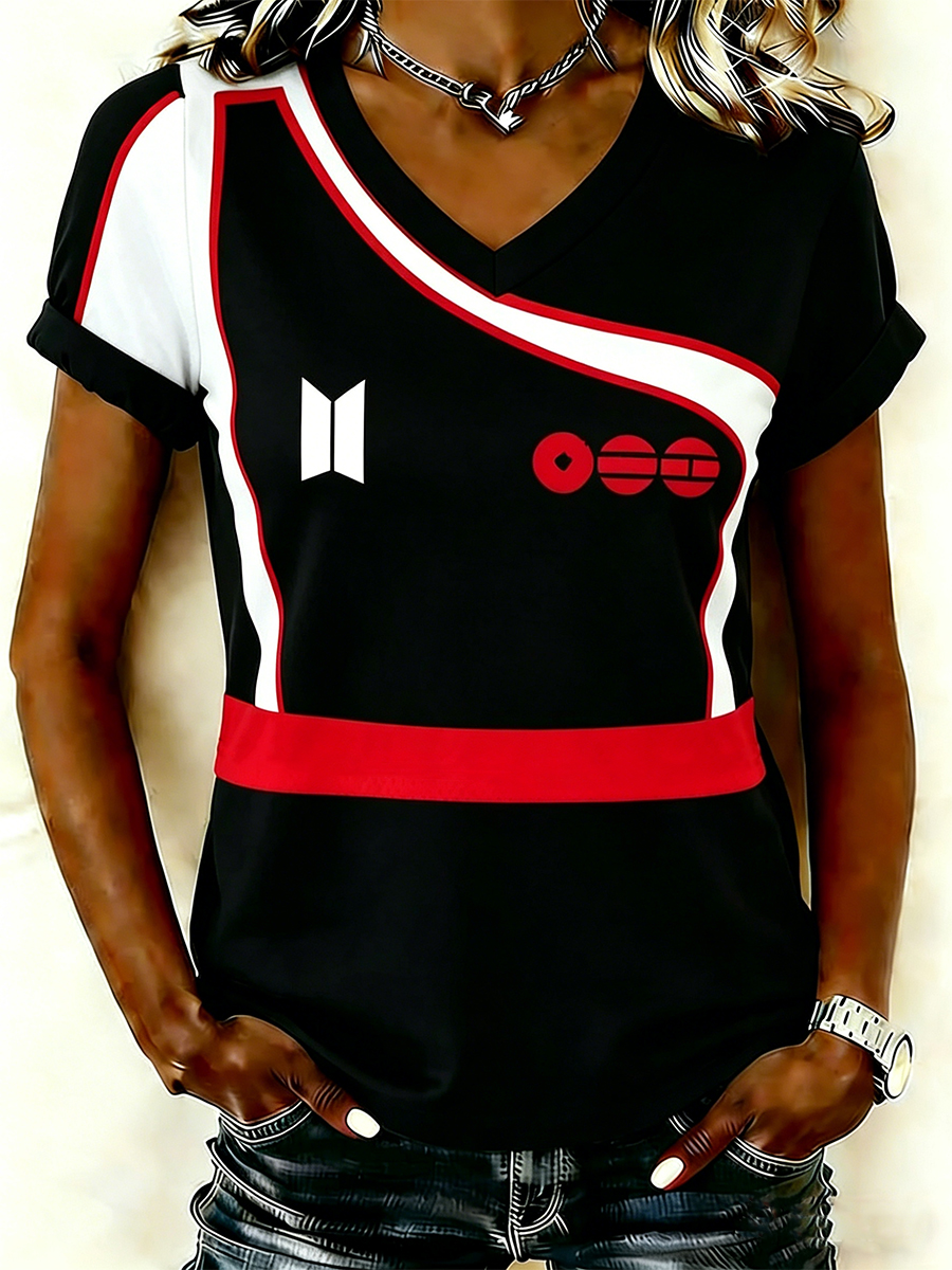 Women's Modern Colorblock V Neck Graphic Symbol Print Casual T-Shirt