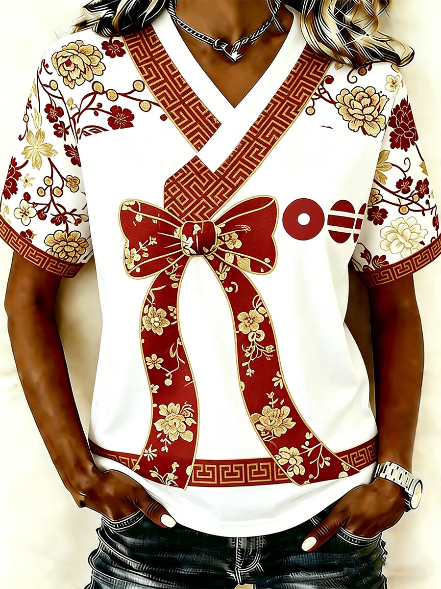Women's Vintage Red Bow and Peony Pattern Print V-Neck T-Shirt$20.99 USD$26.99 USD