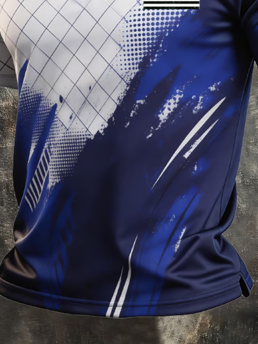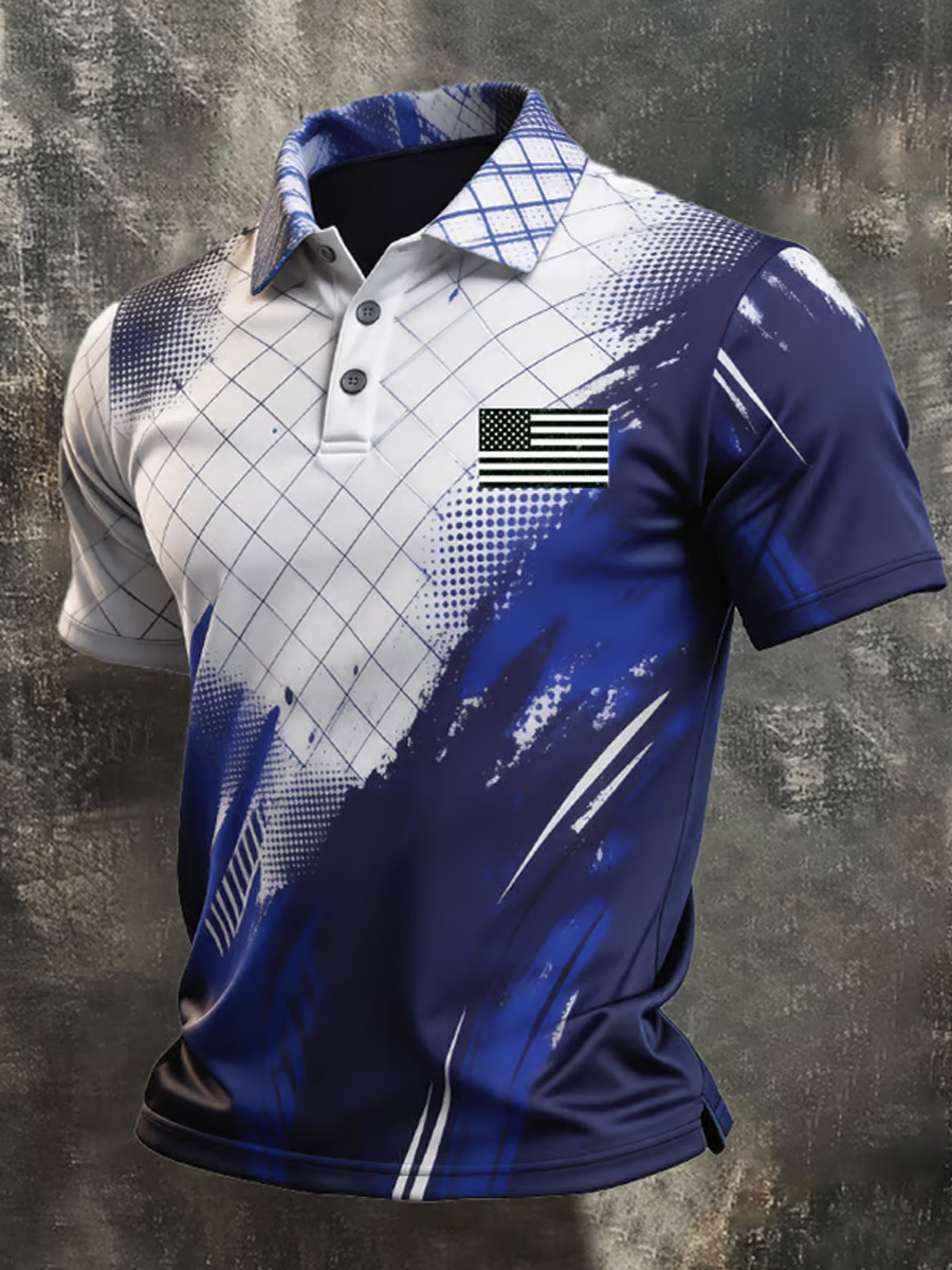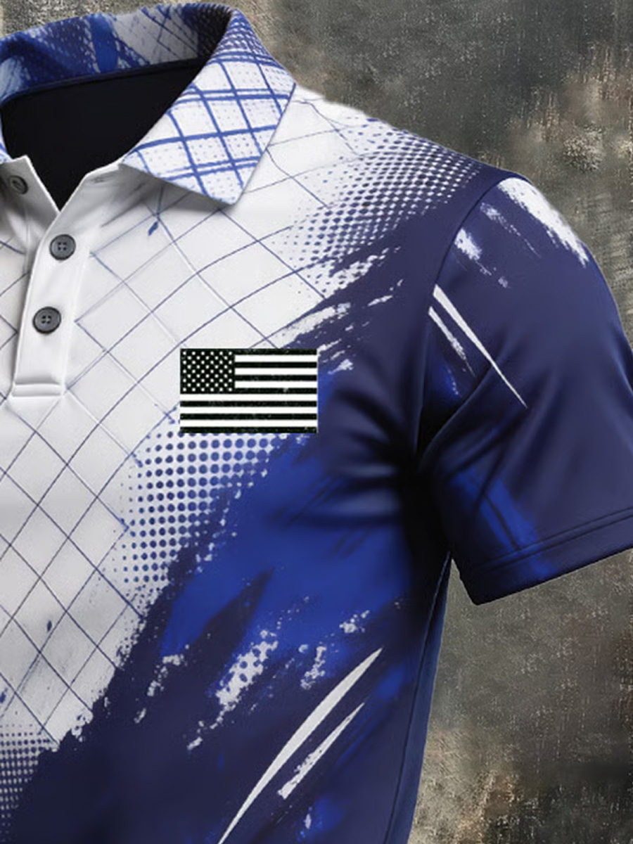 Men's Abstract Brush Stroke Grid Pattern and Monochrome Flag Patch Graphic Polo Shirt