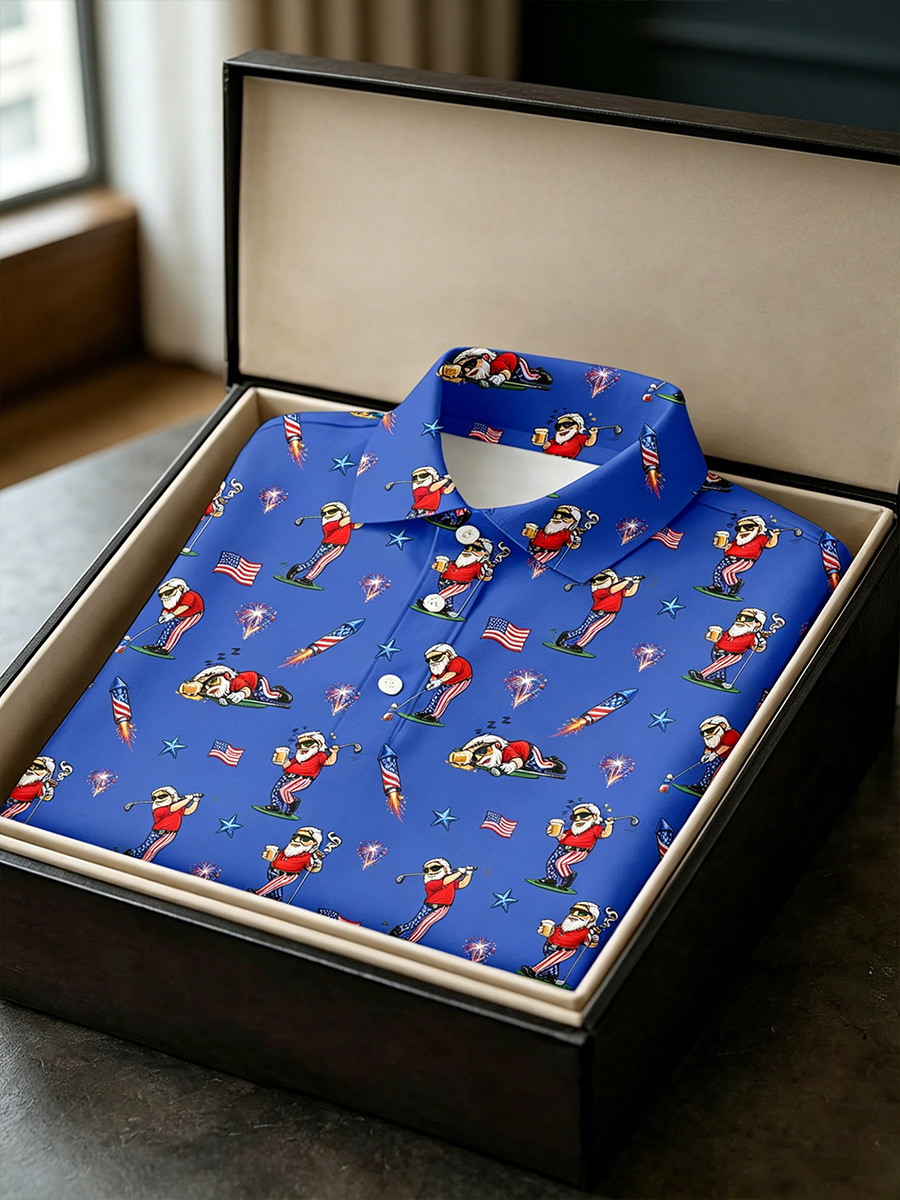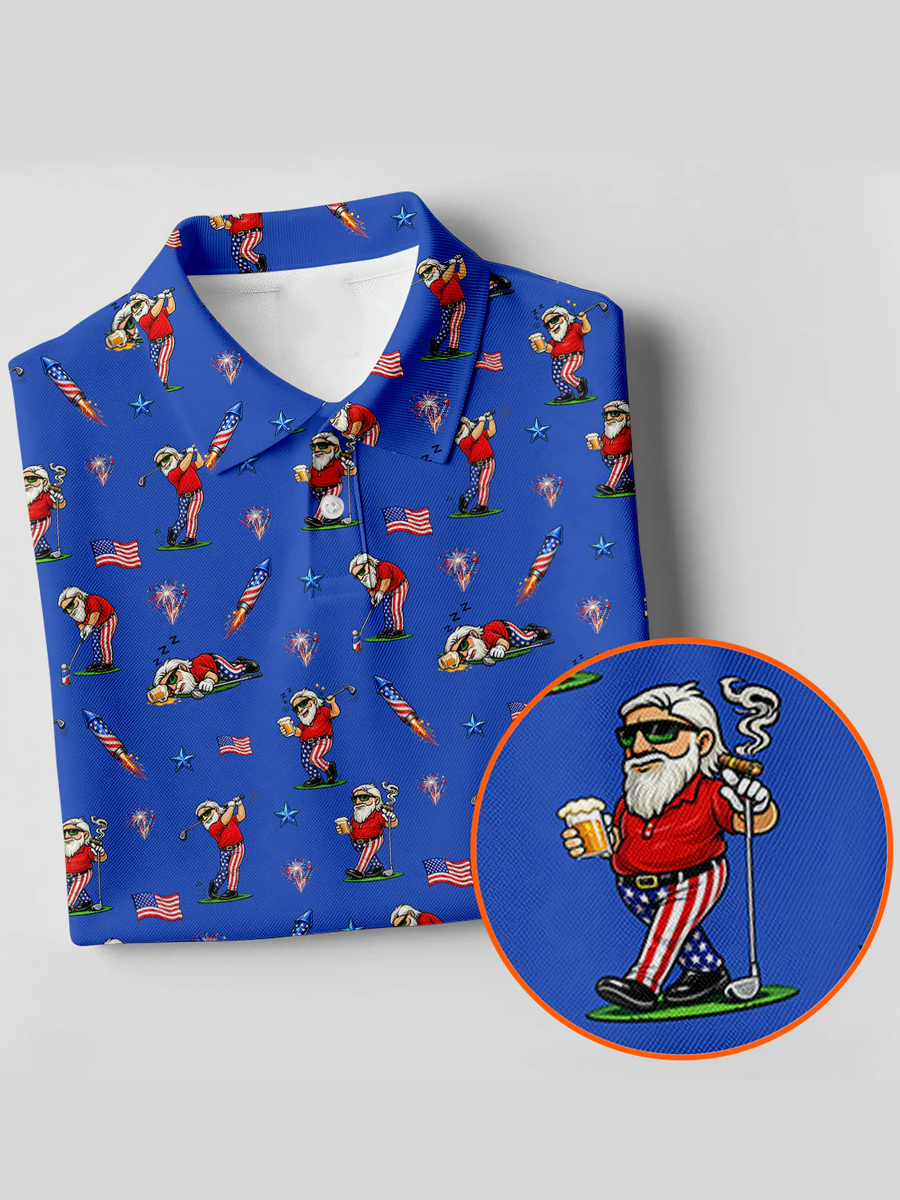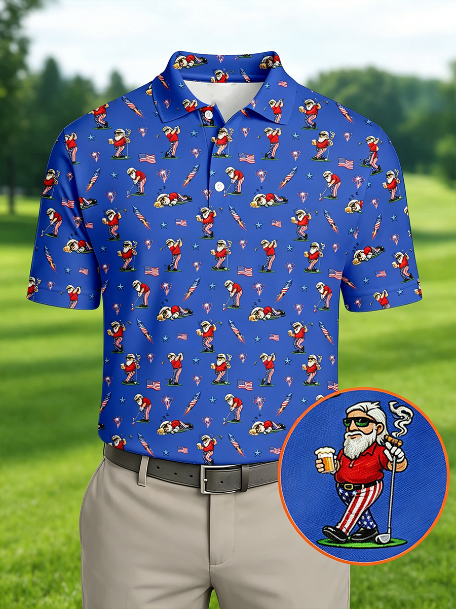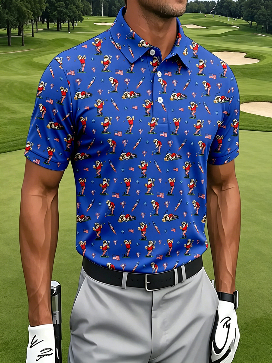 Men's All-Over Cartoon Blue Patriotic Golf Graphic Polo Shirt