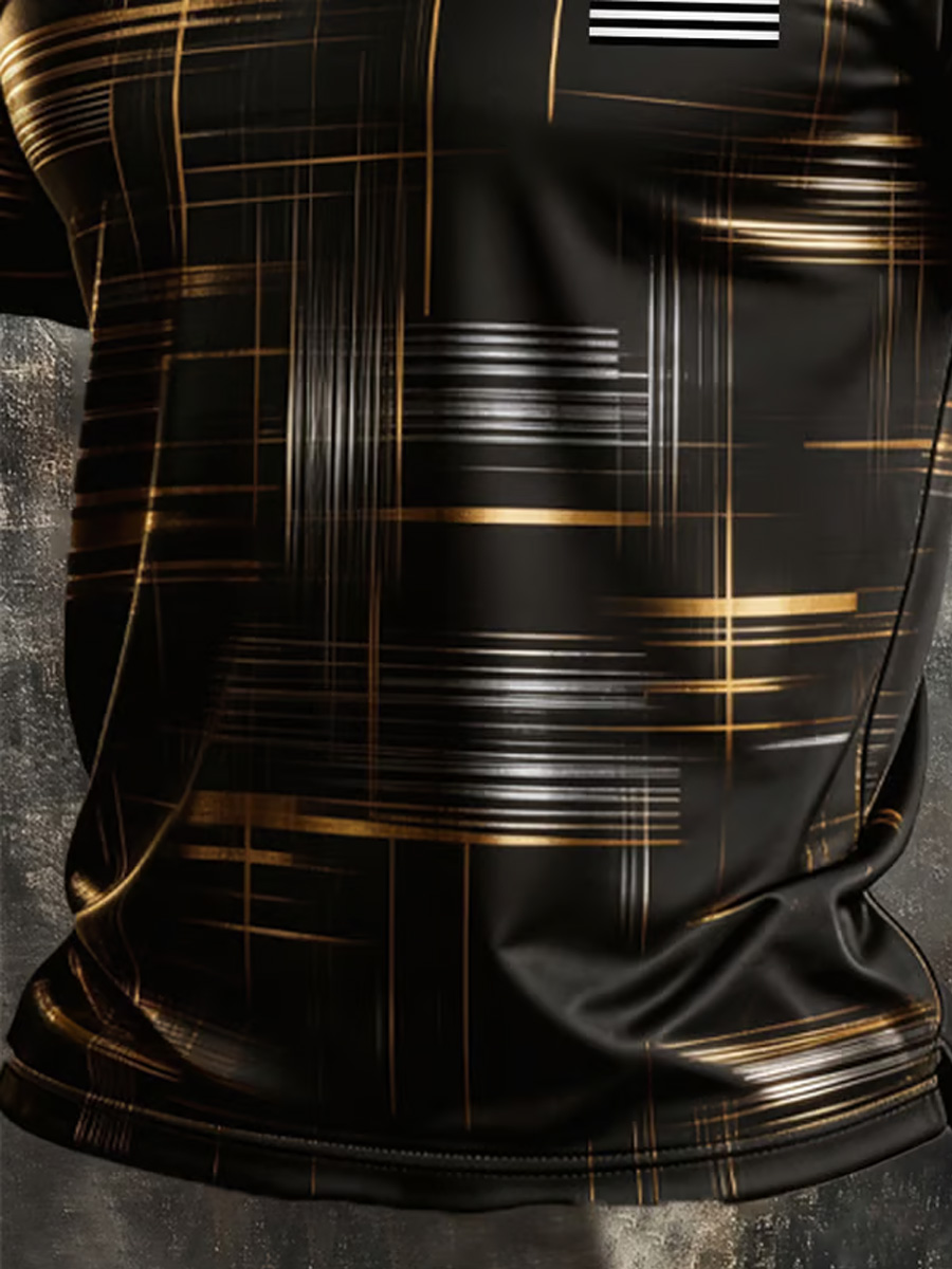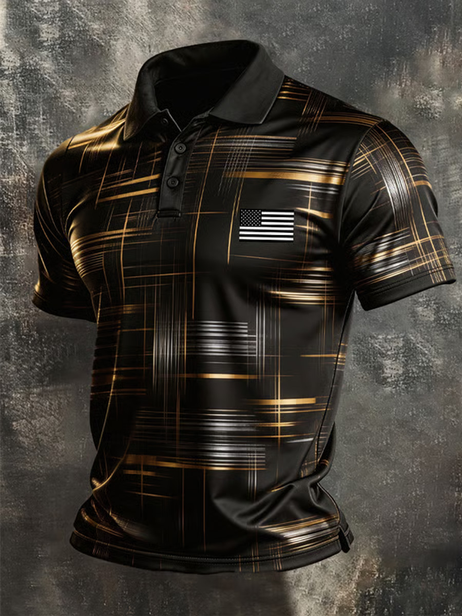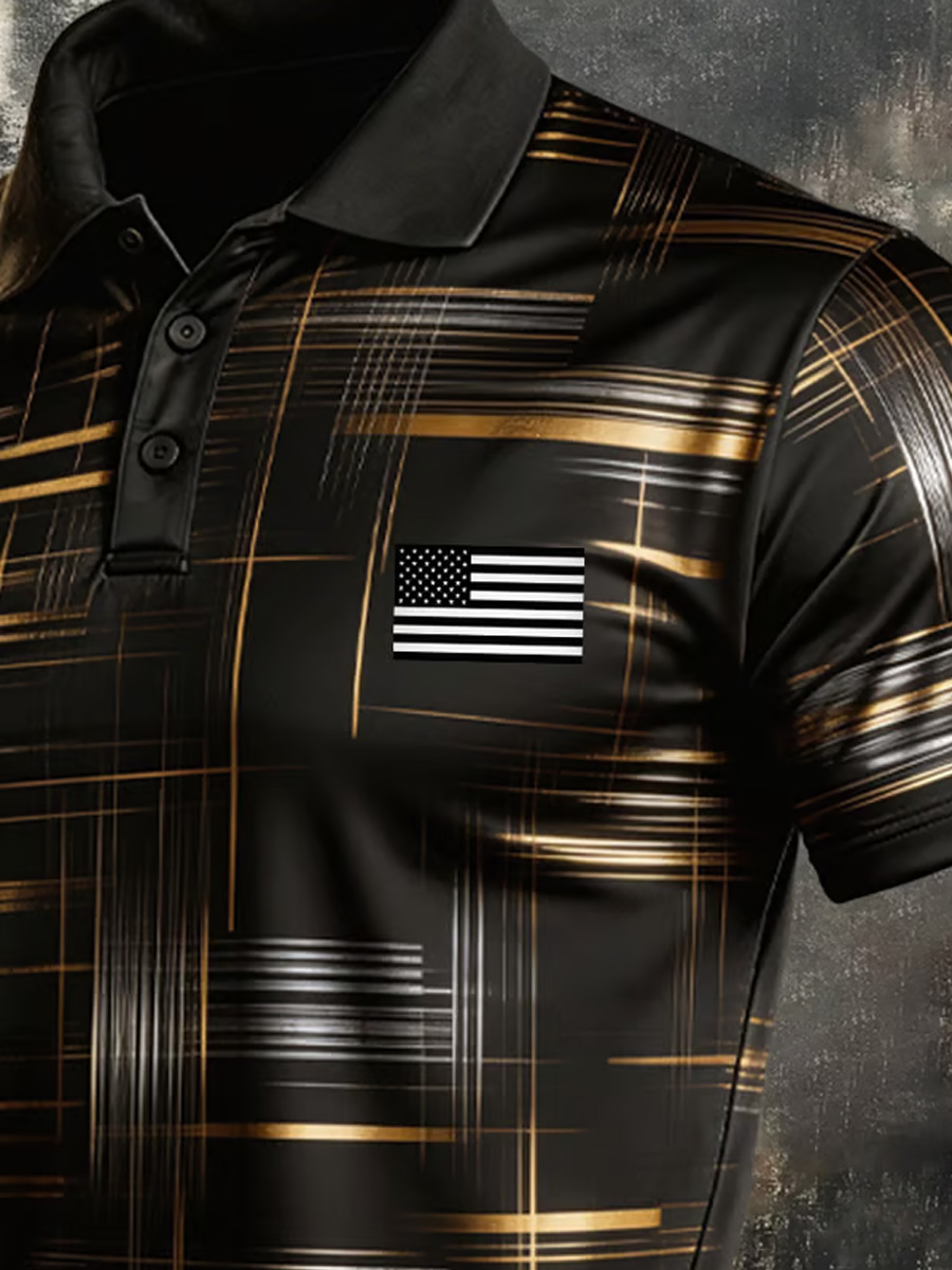 Men's Gold Abstract Plaid Line Graphic Polo Shirt