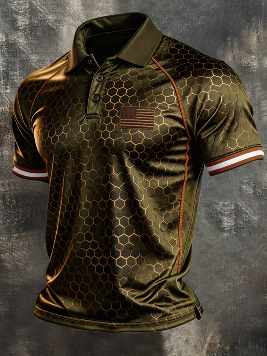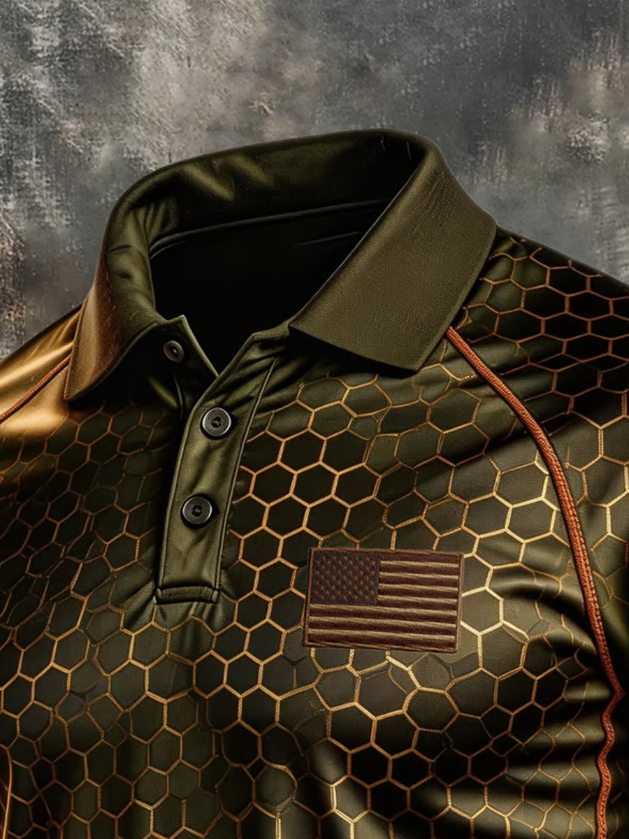 Men's Olive Green Hexagon Pattern and Minimal Flag Patch Graphic Polo Shirt