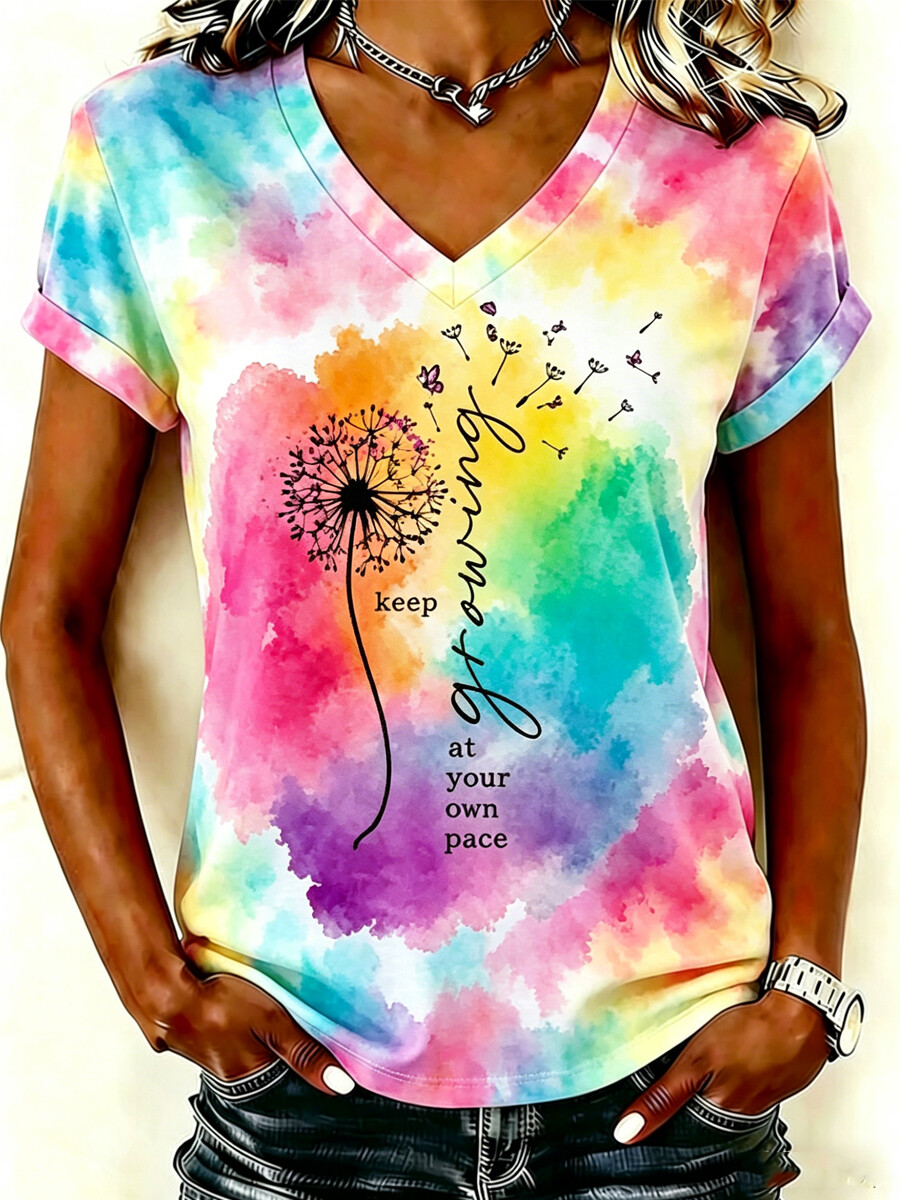 Women's "Keep Growing - At Your Own Pace" Tie-Dye Print V-Neck T-Shirt