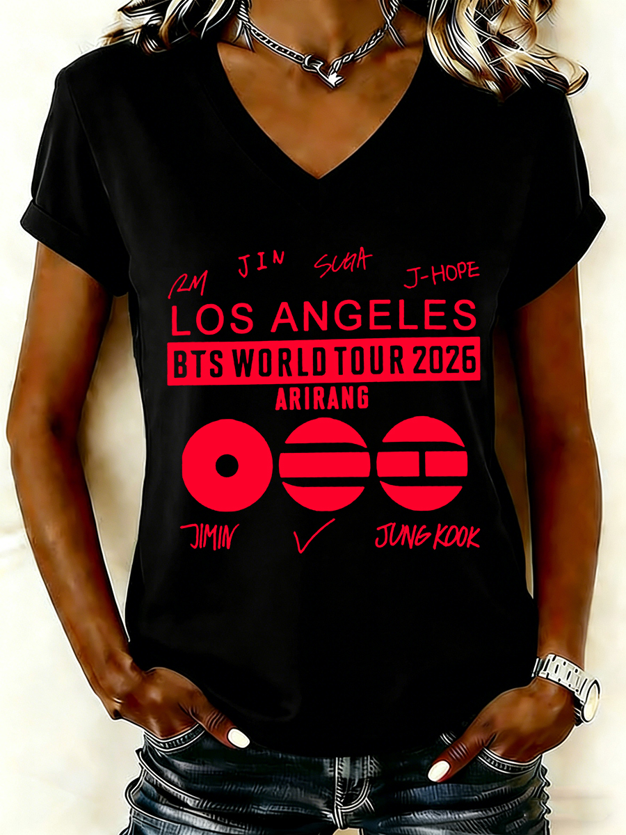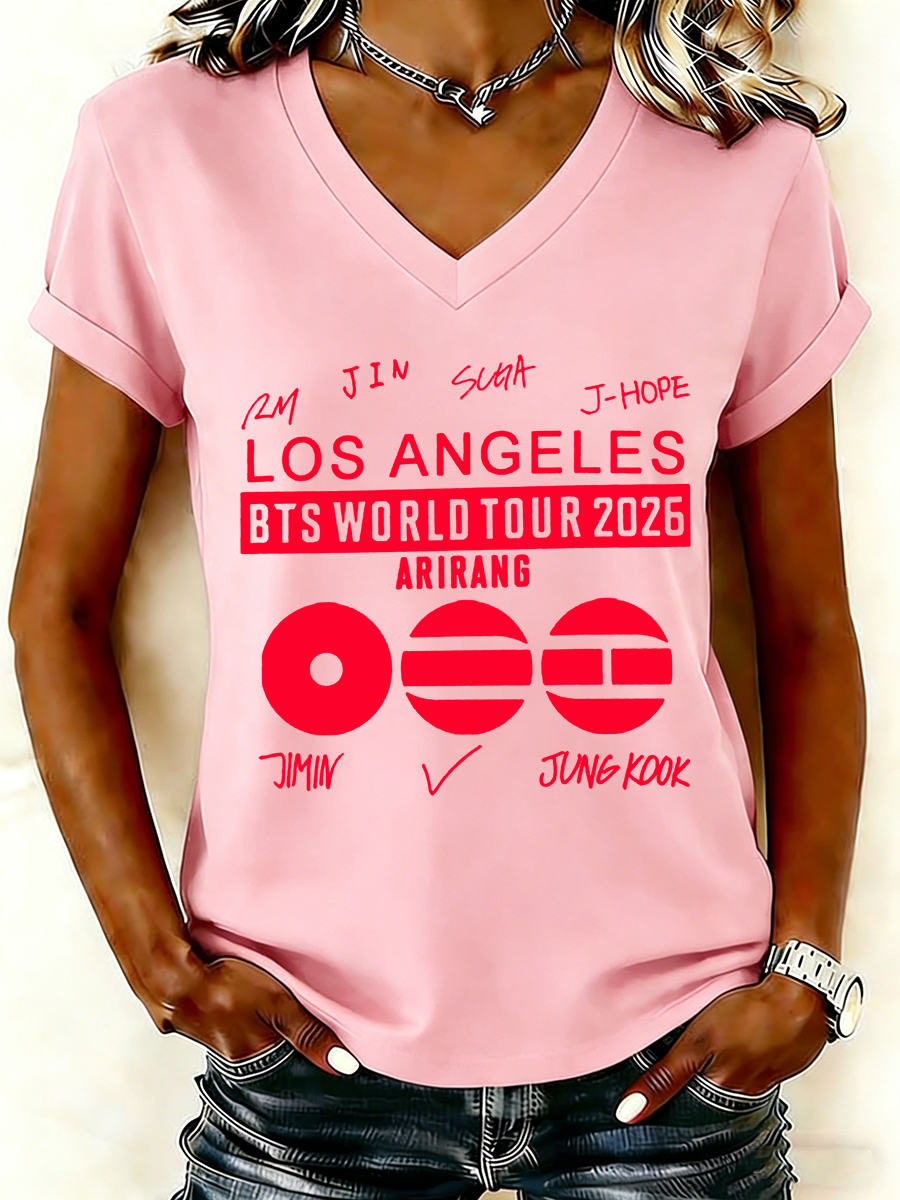 Women's Los Angeles Music Tour 2026 Letter Print V-Neck Graphic Tee