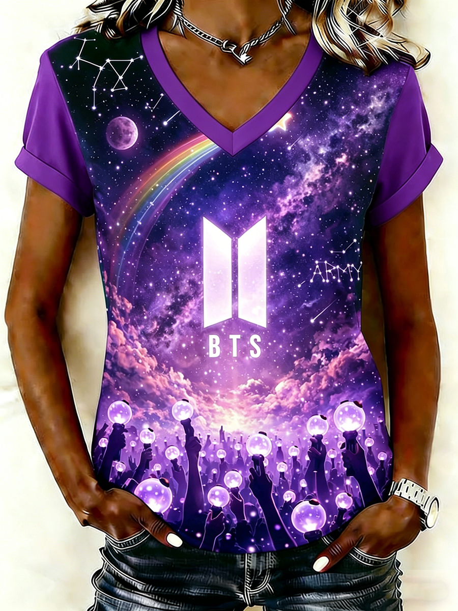 WOMEN'S Purple Galaxy & Rainbow Print V-Neck Short Sleeve T-Shirt