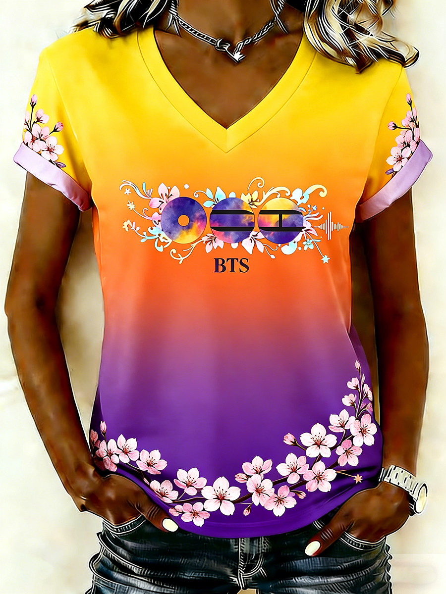 WOMEN'S Yellow-Orange-Purple Gradient Floral Print V-Neck T-Shirt